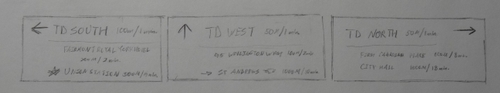 To provide users with directions upon exiting the underground PATH, signposts are to be placed near pedestrian walkways, with directed signs pointed towards the PATH entrance and nearby points of interests. This also establishes a boundary between the PATH system and the outside environment, helpings users better define the location of themselves and a destination with respect to the PATH.
